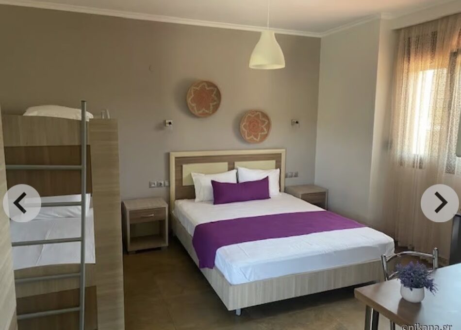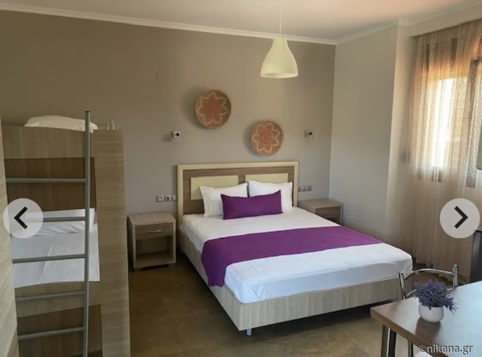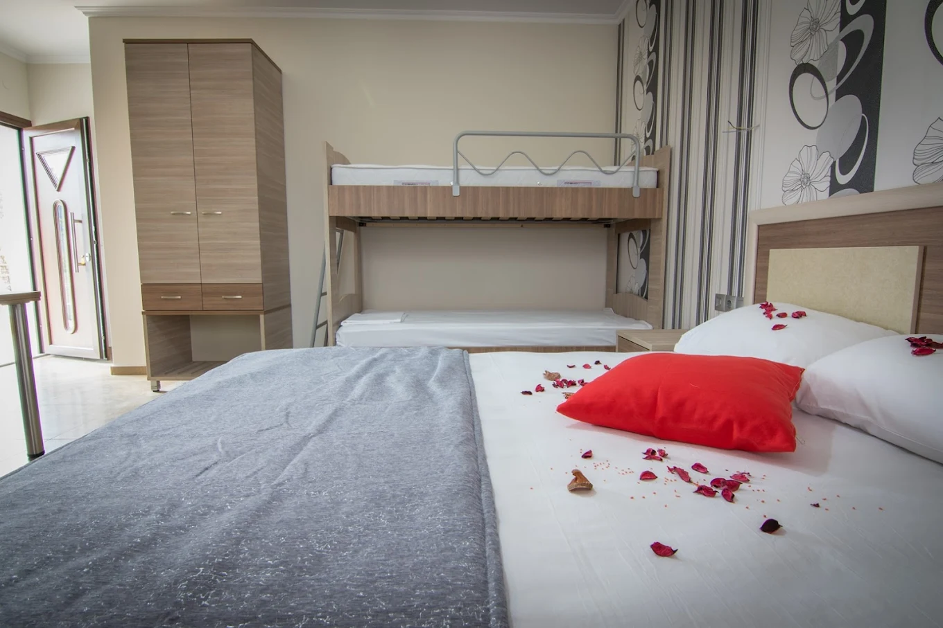Το δωμάτιο έχει μέγεθος 27 τ.μ αποτελείται από ένα υπέρδιπλο κρεβάτι και ένα κρεβάτι – κουκέτα με premium στρώματα. Στο δωμάτιο θα βρείτε εξοπλισμένη κουζίνα με μαγειρική εστία και ιδιωτικό μπάνιο με ντουζιέρα.